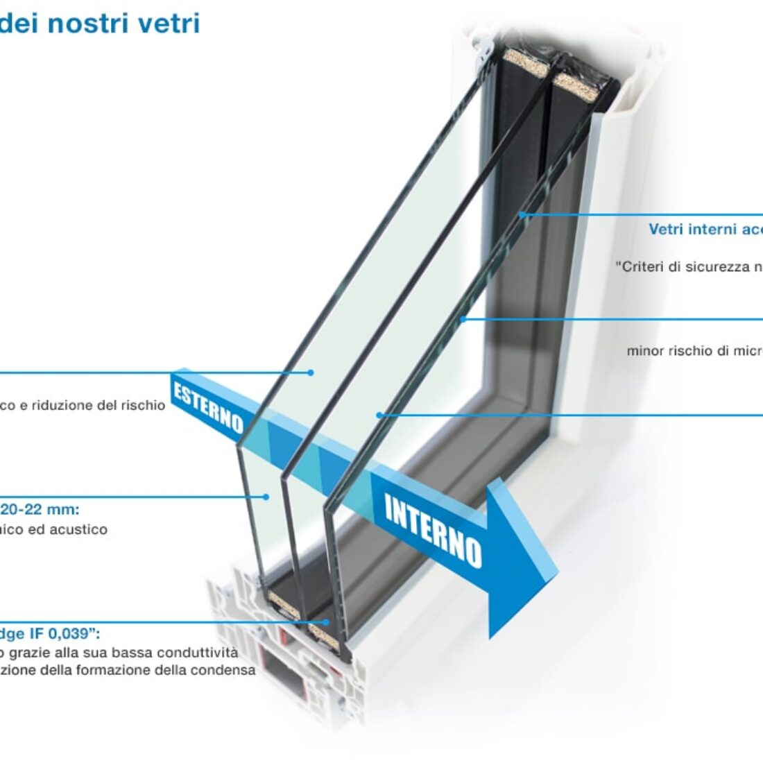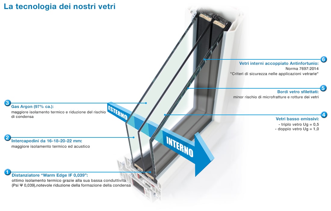 VETRO: Il vetro al giorno d’oggi è diventato una componente fondamentale per la buona riuscita di un serramento, ricoprendo l’80% della superficie dell’infisso ed è per questo che il suo potere isolante è determinante ai fini del comfort abitativo e del risparmio energetico. Tutti i vetri installati sui serramenti IDEAL FENSTER hanno un buon coefficiente termico Ug, grazie anche all’utilizzo del Warm Edge, del gas argon e di trattamenti bassi emissivi, un buon potere fonoassorbente per l’abbattimento acustico grazie all’utilizzo di spessori idonei, permettono una maggiora stabilità dei nostri serramenti grazie all’innovativo sistema di incollaggio strutturale “Glass Fixing”, che garantisce un funzionamento ottimale nel tempo, oltre a una maggiore sicurezza antiscasso.